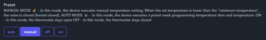 preset: comfort- TRV ignores BT, follows internal algorithmpreset: auto- Follows internal weekly schedulepreset: on- 100% open, alwayspreset: off- Closed, always