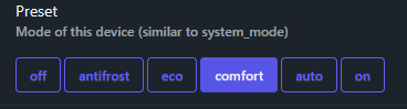 Preset options: off, antifrost, eco, comfort, auto, on