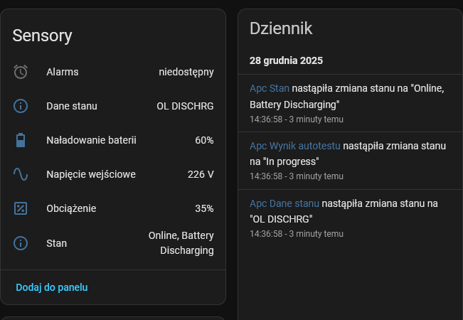 My APC Back-UPS XS 1400U was connected via USB to Home Assistant OS, managed through the Network UPS Tools (NUT) addon. In the HA dashboard, I could see everything: