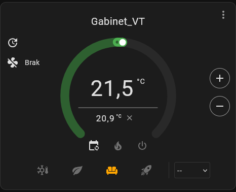 VT has a dedicated card available through HACS: versatile-thermostat-ui-card. This isn't just another thermostat card with a temperature dial. It's built specifically for VT and exposes all the features the integration offers.