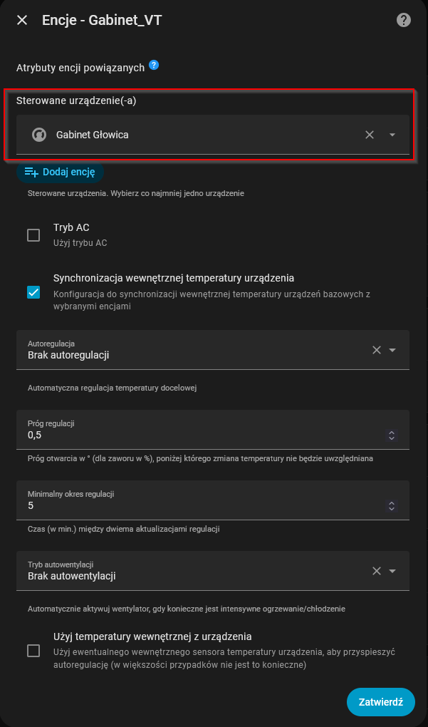 The first critical step is selecting the underlying climate entity. This must be your actual Zigbee device - the climate.living_room_trv or whatever Z2M created for your TRV. Not a group, not a helper, not another virtual thermostat. The real thing.
