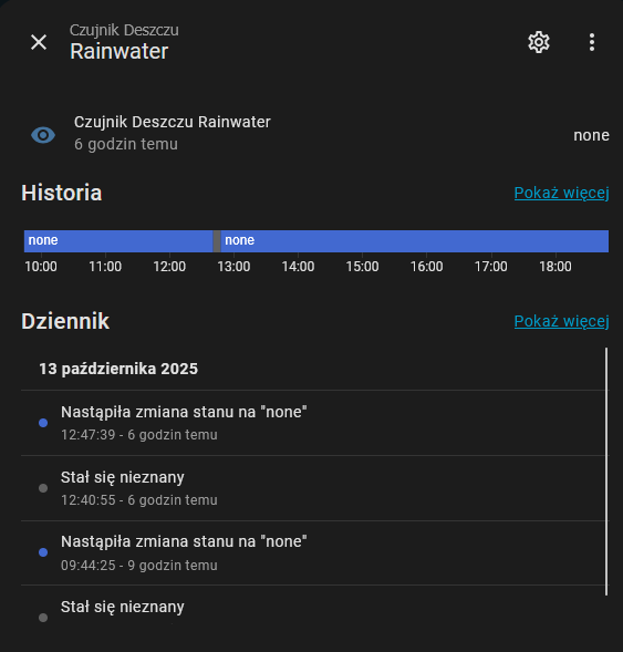 The primary function: it tells you if it's raining or not. Simple binary status: "none" or "raining". No complicated humidity percentages or probability algorithms—just straightforward, reliable rain detection. This is exposed to Home Assistant as rainwater